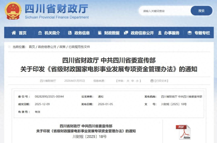 四川出台的新办法明确了省级电影专资的使用范围、分配下达、资金管理、绩效监督等方面内容,并在支持方向上进行了调整。新办法自2025年12月31日起施行,有效期5年。